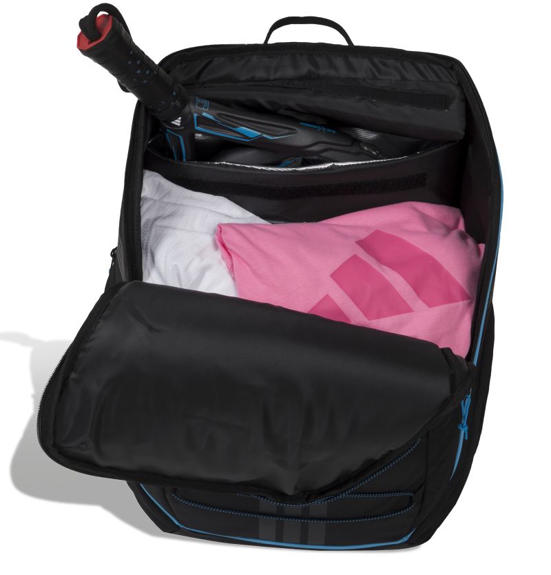 Praktyczny i niezwykle pojemny plecak wykonany z trwałego, poliestrowego materiału. Posiada obszerną komorę główną w kształcie litery U, która zapewni łatwy dostęp do środka oraz wysoki komfort użytkowania. Wewnątrz niej znajduje się dodatkowa przegroda z ochroną termoizolacyjną, która umożliwi przenoszenie rakiety. Druga komora została umieszczona z tyłu, z myślą o komfortowym przechowywaniu laptopa. Dwie zewnętrzne kieszenie boczne na akcesoria zapinane na suwaki. Z przodu plecaka umieszczono elastyczny ściągacz, który pozwoli na dopasowanie objętości plecaka. Uchwyt do noszenia w dłoni wraz z dwiema regulowanymi szelkami pozwolą na komfortowe użytkowanie. Pojemność: 40 litrów.