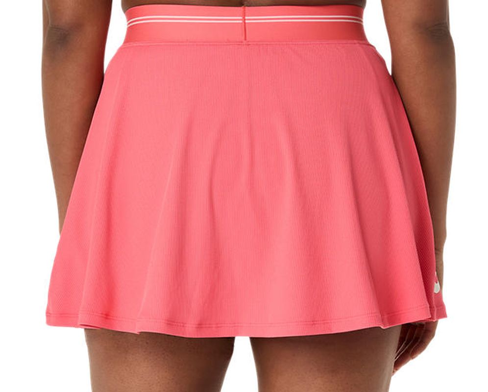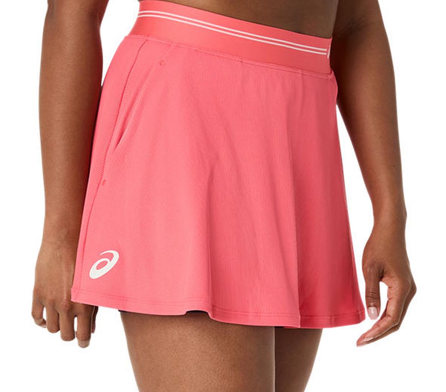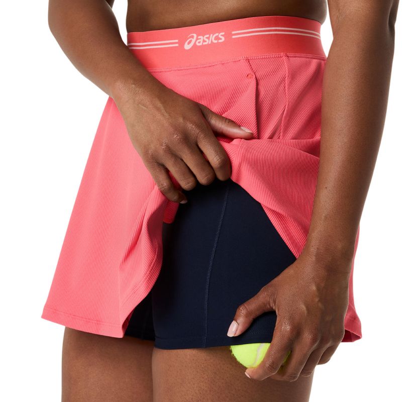 Wykonana z prążkowanego materiału, który dodaje stylowego wyglądu. Elastyczny pas pozwoli na idealne dopasowanie do sylwetki. Wbudowane wewnętrzne sportowe spodenki zwiększają komfort podczas aktywności. Płaskie szwy minimalizują ryzyko otarć i podrażnień. Po bokach dwie siateczkowe kieszenie (na piłki). Spódniczkę wykonano z szybkoschnącego i sprawnie odprowadzającego wilgoć poliestrowego materiału dzięki zastosowaniu technologii DRY.