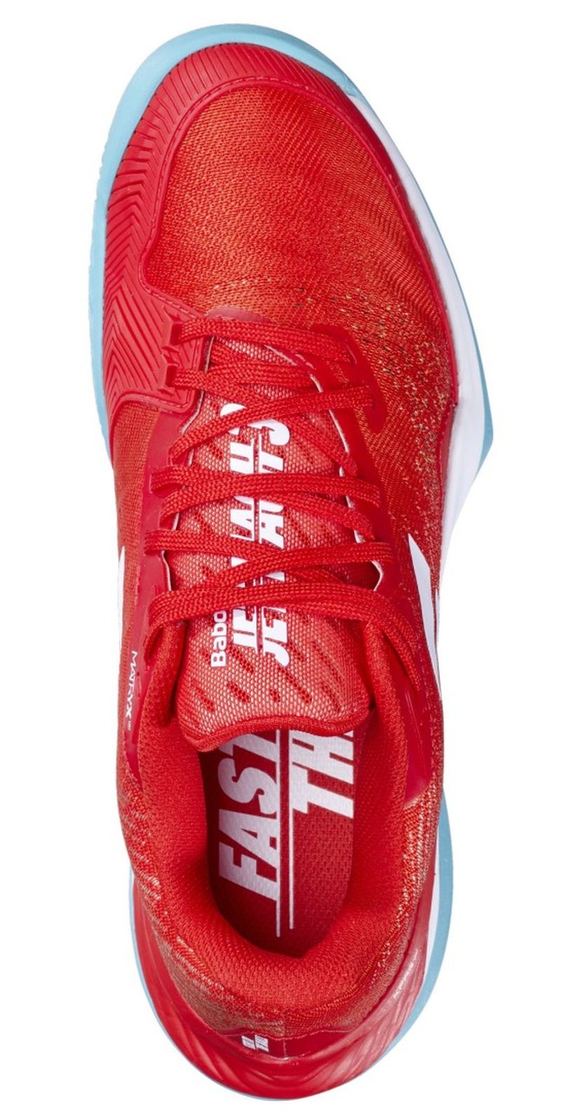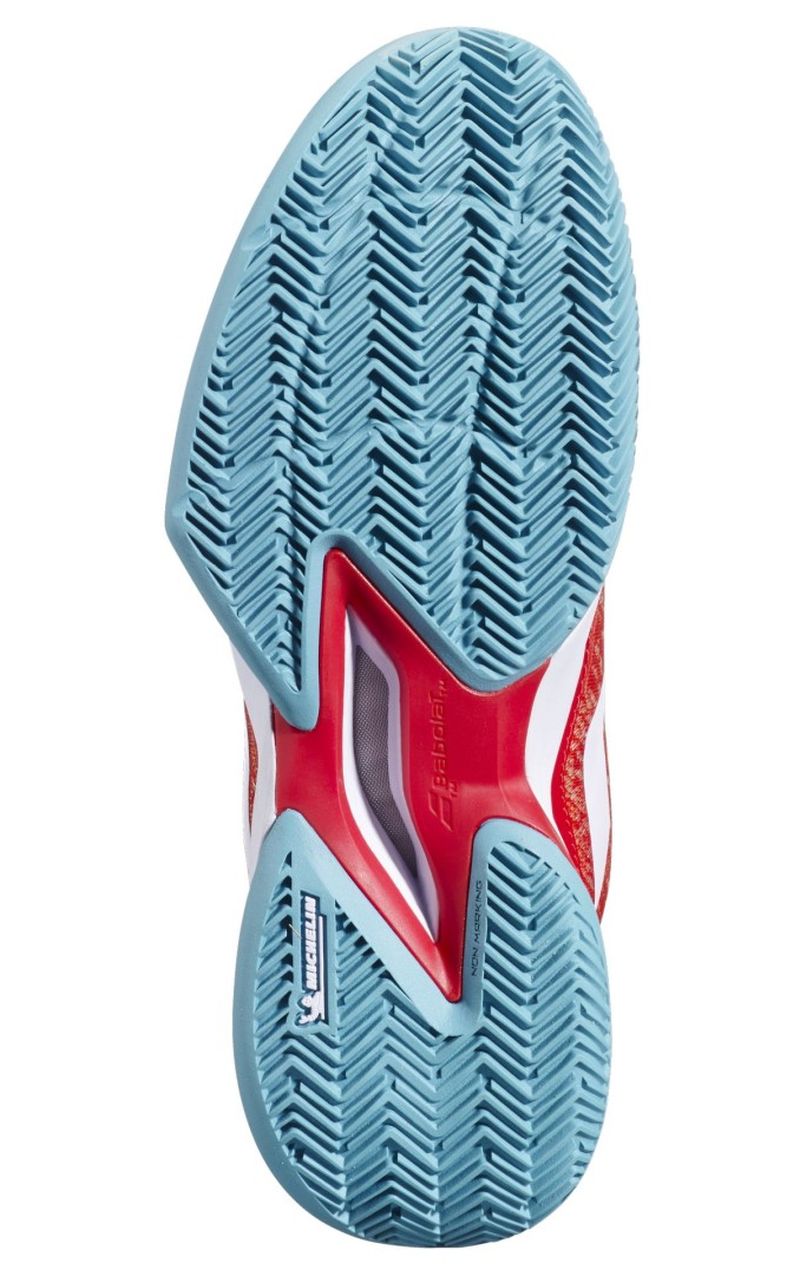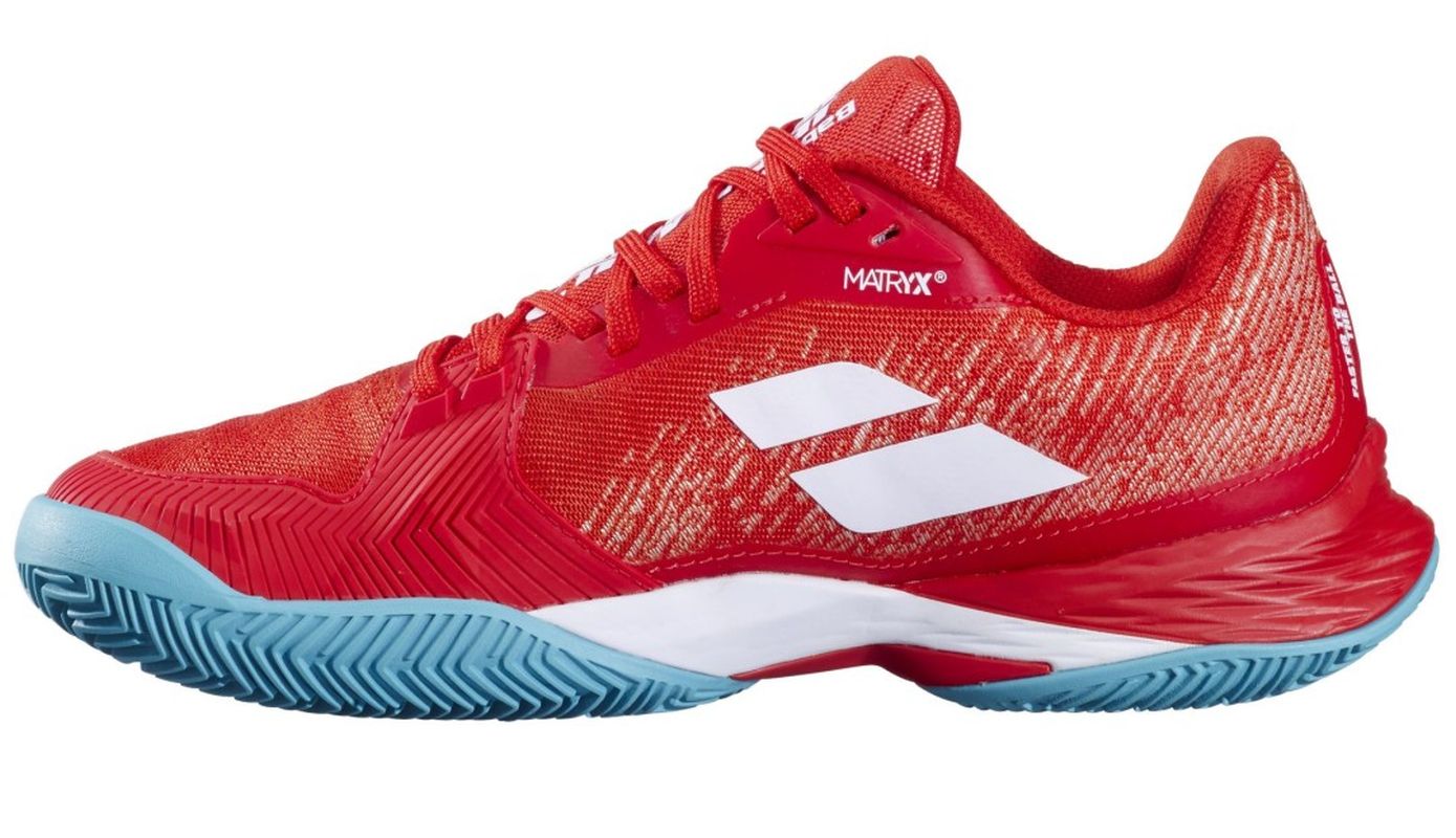 Babolat Jet Mach 3 to jeden z absolutnie najlżejszych butów na rynku tenisowym. Miękka, siateczkowa cholewka zapewnia dobrą oddychalność. Jeszcze większa stabilizacja oraz komfort użytkowania dzięki technologii KPRS-X umieszczonej pod piętą. Górna część buta jest wykonana z jednego kawałka. Technologia Matryx 2.0 sprawia, że but jest trwalszy niż jego poprzednik. Włókna poliamidowe zostały połączone razem z Kevlarem, a następnie wzmocnione włóknami monofilamentowymi, co w efekcie daje nam niezwykle wytrzymały materiał i fantastyczne wsparcie stopy. Dodatkowa stabilizacja poprzez wysunięcie podeszwy w zewnętrznym kierunku w postaci tzw. stopki. Grubsza podeszwa zewnętrzna Michelin zapewnia świetną przyczepność. Jest to idealny wybór dla zawodników poszukujących szybkości oraz komfortu. But z podeszwą przeznaczoną do gry na kortach ceglanych.