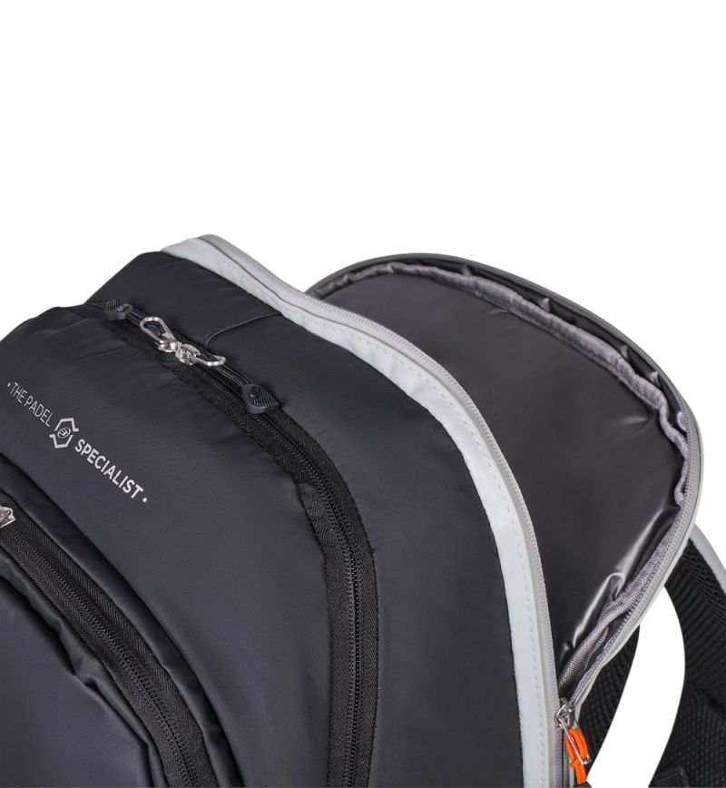 Niezwykle pojemny i funkcjonalny, trzykomorowy plecak sygnowany podpisem Paquito Navarro. Wzmocniona przegroda z ochroną termoizolacyjną pozwoli pomieścić 2. rakiety do padla. Środkowa, największa komora posiada wewnętrzne organizery ułatwiające utrzymanie porządku. Ostatnia z komór swoim rozmiarem przystosowana jest do przenoszenia laptopa. Plecak posiada dwie boczne kieszonki na akcesoria - jedną zamykaną na suwak, drugą siateczkową, z otwartym dostępem. Z przodu większa kieszeń na akcesoria, również zapinana na zamek błyskawiczny. U dołu znajduje się osobna, wentylowana komora na obuwie lub mokrą odzież. Dwie regulowane szelki z paskiem piersiowym oraz tylna część z wygodnymi dla pleców elementami piankowymi pozwolą na komfortowe przenoszenie. Wysoka jakość wykonania i użytych materiałów.