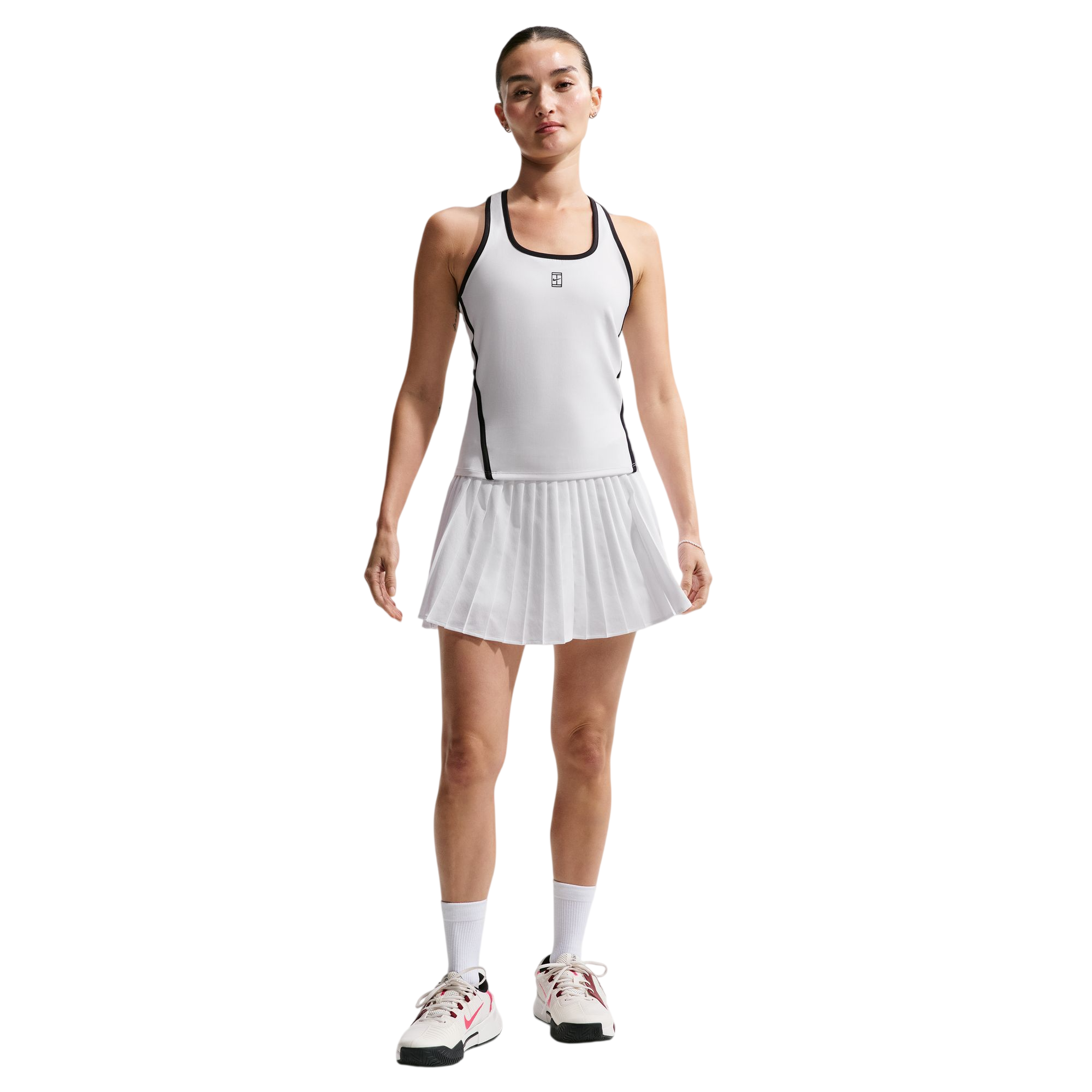 Top wykonany z lekkiego, elastycznego materiału, który dostosowuje się do ruchów, zapewniając swobodę oraz komfort podczas aktywności. Płaskie szwy minimalizują ryzyko otarć i podrażnień. Szerokie wcięcia na plecach zwiększają zakres ruchów. Minimalistyczne logo producenta zostało umieszczone w centralnej części. Top został wykonany z oddychającego, sprawnie odprowadzającego wilgoć materiału z zastosowaniem technologii: DRI-FIT.
