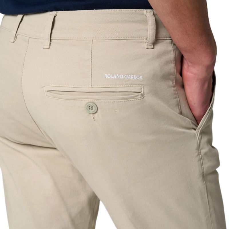 Klasyczne chinosy w ponadczasowym kroju, to doskonała baza do codziennych i półformalnych stylizacji. Wykonane z wysokiej jakości bawełnianej tkaniny z dodatkiem elastanu, zapewniają komfort noszenia i swobodę ruchów przez cały dzień. Prosty krój z delikatnie zwężaną nogawką świetnie podkreśla sylwetkę, a klasyczne detale – takie jak szlufki na pasek, oraz boczne i tylne kieszenie – dodają im eleganckiego charakteru. Idealnie sprawdzą się zarówno w połączeniu z koszulą i loafersami, jak i z T-shirtem oraz sneakersami. Spodnie zdobione napisem Roland Garros.